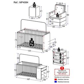 Berço Cômoda Com Poltrona De Amamentação E Puff Meu Bebê Multimóveis Mp4084 Branco Branco O Berço Cômoda com Poltrona de Amamentação e Puff Meu Bebê Multimóveis MP4084 foi criado para complementar o quartinho, facilitando a vida da mamãe nos preparativos para a chegada do bebê. O berço é padrão nacional (tamanho do colchão 130cm x 60cm), produzido em MDP com acabamento acetinado (cerca de 20% de brilho), que garante maior durabilidade e facilidade na limpeza. A cômoda acoplada (não é possível montar separadamente) possui 2 gavetas espaçosas com corrediças metálicas, que proporcionam mais leveza no manuseio e um nicho para deixar o quartinho organizado. O lastro possui 3 regulagens de altura para o colhão e acompanha suporte para mosquiteiro, que garante noites mais tranquilas de sono. Berço Certificado pelo INMETRO sob o Selo n 012251/2022. NÃO ACOMPANHA COLCHÃO. A poltrona de amamentação é produzida em madeira de eucalipto, com revestimento em material sintético, molas reforçadas e mecanismo de balanço, proporcionando muito aconchego. Capaz de suportar 110kg, o assento possui densidade D23, que garante maior conforto e durabilidade. Já o puff possibilita o descanso das pernas e dos pés tornando esse momento ainda mais confortável. Conteúdo da Embalagem: 1 (um) Berço 1 (uma) Poltrona 1 (um) Puff Kit Ferragem Manual de Montagem