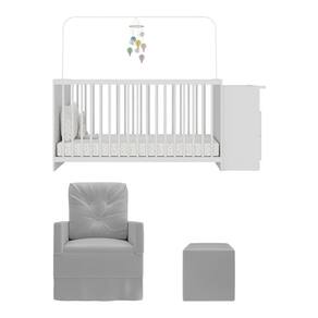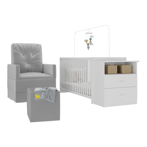 Berço Cômoda Com Poltrona De Amamentação E Puff Meu Bebê Multimóveis Mp4078 Branco/cinza Branco/cinza O Berço Cômoda com Poltrona de Amamentação e Puff Meu Bebê Multimóveis MP4078 foi criado para complementar o quartinho, facilitando a vida da mamãe nos preparativos para a chegada do bebê. O berço é padrão nacional (tamanho do colchão 130cm x 60cm), produzido em MDP com acabamento acetinado (cerca de 20% de brilho), que garante maior durabilidade e facilidade na limpeza. A cômoda acoplada (não é possível montar separadamente) possui 2 gavetas espaçosas com corrediças metálicas, que proporcionam mais leveza no manuseio e um nicho para deixar o quartinho organizado. O lastro possui 3 regulagens de altura para o colhão e acompanha suporte para mosquiteiro, que garante noites mais tranquilas de sono. Berço Certificado pelo INMETRO sob o Selo n 012251/2022. NÃO ACOMPANHA COLCHÃO. A poltrona de amamentação é produzida em madeira de eucalipto, com revestimento em tecido veludo, molas reforçadas e mecanismo de balanço, proporcionando muito aconchego. Capaz de suportar 110kg, o assento possui densidade D23, que garante maior conforto e durabilidade. Já o puff possibilita o descanso das pernas e dos pés tornando esse momento ainda mais confortável. Conteúdo da Embalagem: 1 (um) Berço 1 (uma) Poltrona 1 (um) Puff Kit Ferragem Manual de Montagem