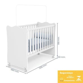 Berço Doce Sonho Branco Com Rodízios E Colchão Baby Physical - Qmovi Branco Berço Doce Sonho com Rodízios e Colchão Baby Physical - Qmovi O Berço Doce Sonho foi projetado especialmente para oferecer conforto e ao bebê. Com um design clássico e delicado, ele garante beleza e aconchego para o ambiente. O berço possui certificado do INMETRO, o que proporciona noites mais tranquilas e seguras. E para completar o Colchão Baby Physical da Ortobom vai proporcionar noites mais tranquilas a aconchegantes. Uma escolha de amor e cuidado com o seu bebê. Berço Doce Sonho com Rodízios - Qmovi - Estrutura em MDP - Pintura UV atóxica - Padrão - Grades fixas - Estrado e travessas em MDF - Acabamento das bordas com perfil PVC - Estrado regulado em 3 alturas: 1- 35cm, 2- 48cm, 3- 61cm - Acompanha suporte para mosquiteiro - Certificado compulsório do INMETRO 007190/2017 - 4 Rodízios, sendo 2 com trava - Colchão recomendado 60x130cm