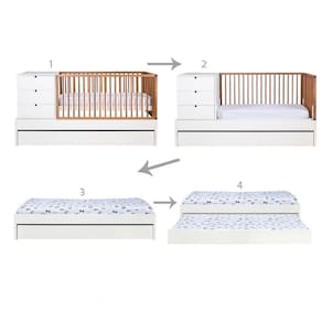 Um berço multiuso com grades ergonômicas em madeira maciça, que oferece módulo trocador com gavetas telescópicas e nichos laterais e também cama auxiliar. As peças são avulsas e possibilitam a transformação do berço em cama de solteiro e do módulo trocador em mini cômoda. O berço é fabricado em MDF e madeira natural com pintura atóxica, e ainda oferece 05 regulagens de altura de estrado.