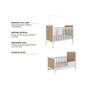 Material de Estrutura - MDF Tipo de Pintura - Ultravioleta Tipo de Acabamento da Pintura - Semi Brilho Material do Estrado - Estrado Regulável Tamanho de colchão para usar no berço - 70x130 Diferenciais dos Móveis Infantis - Suporte p/ Mosquiteiro - Berço Multiuso - Grade de