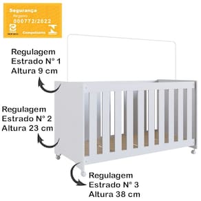 Berço Infantil certificado pelo INMETRO n° 000772/2022, além de ser um produto versátil e multifuncional, conta com um design lindo e sofisticado, deixando o ambiente ainda mais moderno e aconchegante. Estrutura em MDP de 15 mm, feito com material ecologicamente correto, para melhor durabilidade e resistência à peça, e excelente acabamento em Finish Foil (Fosco). Composto por estrado em MDF de 6 mm com altura regulável em três opções: 1ª: 15 cm 2ª: 29 cm e 3ª: 44 cm, travessas em MDF de 15 mm, grades fixas em MDF de 12 mm, com espaço entre elas de 5,5 cm e acabamento em BP, acompanha suporte para mosquiteiro e rodízios plásticos. O colchão indicado é de 130x60 cm (Não Acompanha Colchão). Suporta até 30 kg distribuídos. Este móvel chegará em sua casa separado em 02 volumes.