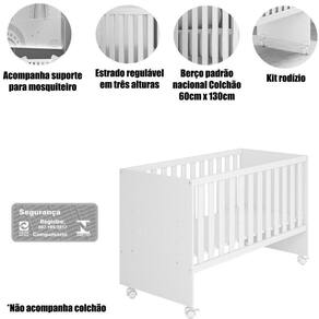 O Berço Reto Doce Mel foi projetado especialmente para oferecer conforto e ao bebê. Com um design clássico e delicado, ele garante beleza e aconchego para o ambiente. O berço acompanha suporte para mosquiteiro, que proporciona noites mais tranquilas e seguras. O berço infantil possui certificação compulsória de acordo com as portarias do Inmetro. O berço infantil é feito em MDP de 12 mm, pintura atóxica e livre de materiais pesados, para total do bebê, estrado regulável em três alturas que possibilita que conforme o crescimento do bebê, mais profundo fica o berço. Medida ideal para colchão de 60cm x 130cm e kit de Rodízios conta com travas em apenas 2 rodízios.