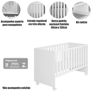 O Berço Reto Doce Mel foi projetado especialmente para oferecer conforto e ao bebê. Com um design clássico e delicado, ele garante beleza e aconchego para o ambiente. O berço acompanha suporte para mosquiteiro, que proporciona noites mais tranquilas e seguras. O berço infantil possui certificação compulsória de acordo com as portarias do Inmetro. O berço infantil é feito em MDP de 12 mm, pintura atóxica e livre de materiais pesados, para total do bebê, estrado regulável em três alturas que possibilita que conforme o crescimento do bebê, mais profundo fica o berço. Medida ideal para colchão de 60cm x 130cm e kit de Rodízios conta com travas em apenas 2 rodízios.