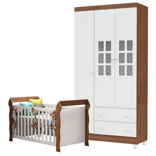 Berço Lara e Guarda Roupa Infantil 3 Portas Mariah Branco Acetinado Amadeirado - Carolina