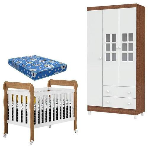 Berço Lila e Guarda Roupa Mariah 3 Portas Branco Acetinado Amadeirado com Colchão Carolina