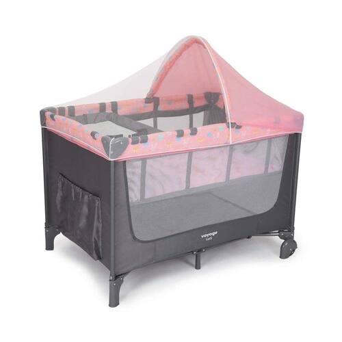 A capota tem alças para prender os brinquedos preferidos do bebê e poder ser removida, acompanha também um mosquiteiro com arco para manter-se elevado. Inclui ainda, trocador removível e reposicionável com cinto de segurança, rodas com freio, amplo bolso porta-objetos, laterais com tela, colchonete macio que tem fixação lateral com zíper, mais segura.