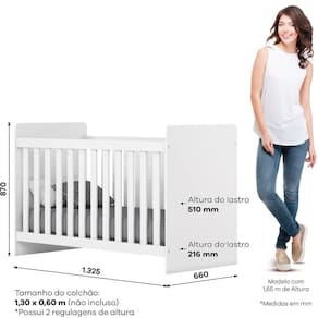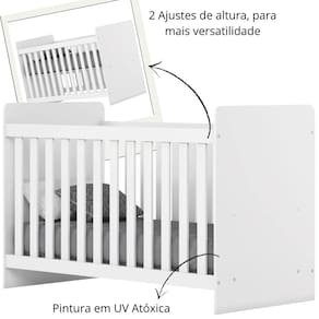 Com duas posições de estrado, você ajusta a altura ideal para cada fase do bebê. A grade fixa e o espaçamento seguro entre as barras garantem noites tranquilas de sono.
