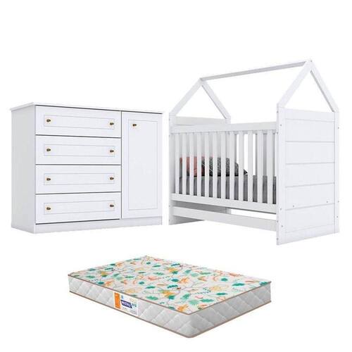 Berço Montessoriano Americano e Cômoda Infantil Mississipi Branco com Colchão Gazin Henn