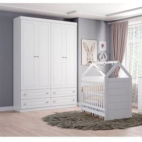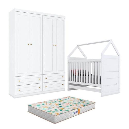 Berço Montessoriano e Guarda Roupa Infantil Americano 4 Portas Branco com Colchão Gazin - Henn