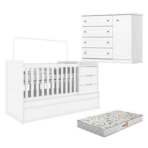Berço Multifuncional Cleo e Cômoda Infantil Americano Branco Fosco com Colchão Gazin - Henn