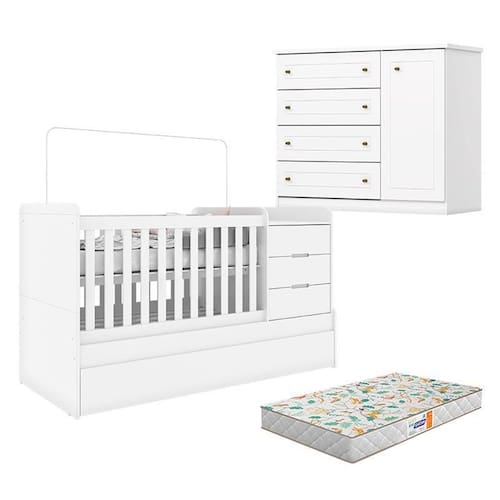 Berço Multifuncional Cleo e Cômoda Infantil Mississipi Branco Fosco com Colchão Gazin - Henn