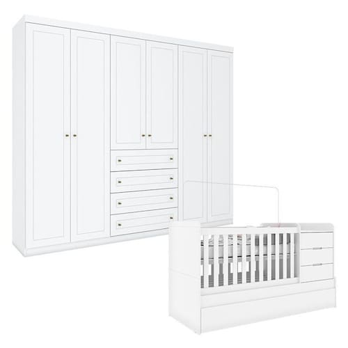 Berço Multifuncional Cleo e Guarda Roupa 6 Portas Americano Branco Fosco - Henn