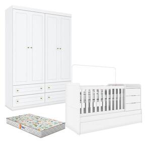 Berço Multifuncional Cleo e Guarda Roupa Infantil 4 Portas Americano Branco Fosco com Colchão Gazin - Henn