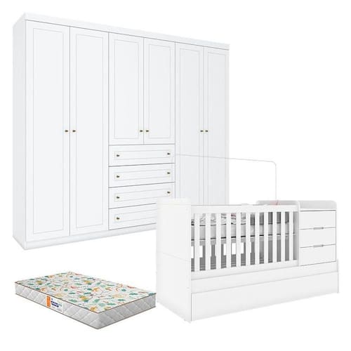 Berço Multifuncional Cleo e Guarda Roupa Infantil 6 Portas Mississipi Branco Fosco com Colchão Gazin - Henn
