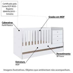 Características- Branco - Estrutura: MDP - Acabamento: BP Fosco - Berço com Cômoda acoplada - 1 Cama auxiliar com rodízios - 3 Gavetas - Corrediças metálicas - Grades nas laterais em PVC - 3 Puxadores em PVC - 4 Pés com sapatas plásticas - Certificado pela Certa OCP 0033 - Registro 004976/2019 - Inmetro - Berço com 2 regulagens de altura (1- 43 cm / 2 - 71 cm ) - Colchão de 128x68 cm para o berço. O Colchão não está incluso ao produto. Vendido separadamente - Colchão de 188x78 cm para cama solteiro. O Colchão não está incluso ao produto. Vendido separadamente - Colchão de 188x78 cm para cama solteiro. O Colchão não está incluso ao produto. Vendido separadamente - Distância entre as barras das grades: 5,5 cm - Peso suportado como berço: 30 kg - Peso suportado como cama solteiro: 50 kg - Peso suportado na cama auxiliar: 80 kg - Peso suportado criados por prateleira: 10 kg - Peso suportado por gaveta: 5 kg - Marca Completa Móveis - Garantia de 3 meses para defeito de fabricação