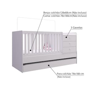 Um excelente custo benefício, sendo 3 peças em um só móvel. A Versatilidade do móvel está na sua montagem e no seu uso ao longo das fases de bebê até a infância. Pode ser montado no padrão berço com cômoda e apoio para o trocador e, também, ser transformado em uma cama solteiro. O Grande diferencial dessa peça é a cama auxiliar, perfeita para o bebê dividir o quarto com o irmãozinho ou irmazinha e até mesmo, receber a vovò no final de semana. As grades são em PVC injetado dando maior segurança e tranquilidade para o bebê e pais. Um móvel perfeito para otimizar espaço e ainda, trazer charme e organização ao ambiente!