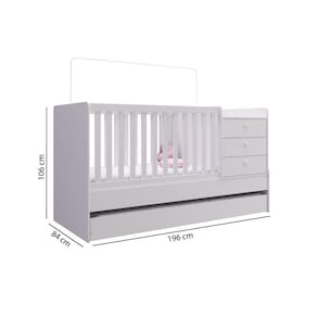 Dimensões Berço com Cômoda Peso: 63,08 Kg Altura: 106 cm Largura: 196 cm Profundidade: 84 cm