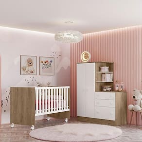 Berço Nacional 3540 e Guarda Roupa com Cômoda 4070 Ambiente Doce Sonho Carvalho Rústico TOQ Branco – Qmovi