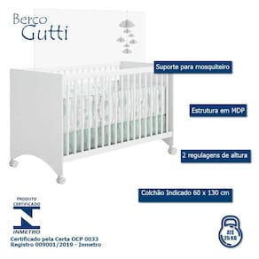Decore o cantinho do bebê com um móvel que irá garantir conforto e noites tranquilas! Apresentamos o Berço Nacional Gutti, desenvolvido pela Móveis Estrela. Acompanha suporte para mosquiteiro, colchão Gazin na medida 60x130cm, possui 2 regulagens de altura e suporta até 25kg. Ainda conta com um design minimalista e moderno, Kit rodízios, acabamento em pintura uv e estrutura em MDP resistente e de alta durabilidade, garantindo a utilização por muito mais tempo. Confira mais detalhes abaixo, compre com a gente e receba no conforto de sua casa!
