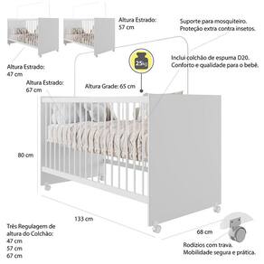 Decore o cantinho do bebê com um móvel que irá garantir conforto e noites tranquilas! Apresentamos o Berço Nacional Gutti, desenvolvido pela Móveis Estrela. Acompanha suporte para mosquiteiro, possui 2 regulagens de altura e suporta até 25kg. Ainda conta com um design minimalista e moderno, Kit rodízios, acabamento em pintura uv e estrutura em MDP resistente e de alta durabilidade, garantindo a utilização por muito mais tempo. Confira mais detalhes abaixo, compre com a gente e receba no conforto de sua casa!