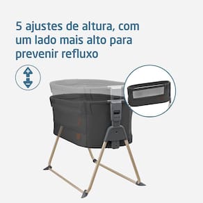 Características: Compacto e leve, fácil de guardar e transportar 5 ajustes de altura e posição anti-refluxo Laterais em malha respirável para ventilação contínua Colchão extra-confortável, ideal desde o nascimento Tecido 100% reciclável e lavável na máquina Bolsa de transporte inclusa para maior praticidade Montagem e desmontagem rápidas Aprovado pelos principais padrões de segurança