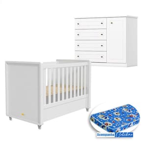 Berço Tutto New e Cômoda Infantil Mississipi Branco Fosco com Colchão Ortobom - Matic