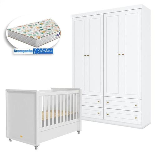 Berço Tutto New e Guarda Roupa Infantil Americano 4 Portas Branco Fosco com Colchão Gazin - Matic