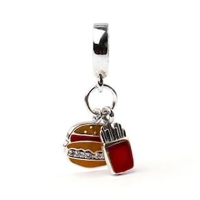 Em um mesmo berloque, dois amores O Berloque Pingente Hambúrguer e Batatas Fritas é composto por dois pingentes em um mesmo separador. Um deles, uma deliciosa batata frita com a clássica embalagem vermelha. Já o outro, um hambúrguer com um recheio de apliques de Zircônias. O passador liso, evidencia ainda mais os incríveis detalhes esse berloque é perfeito para quem ama fast food.