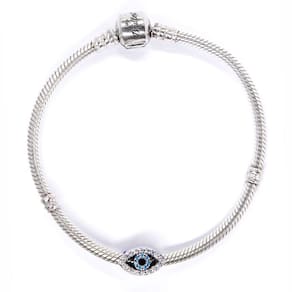 O Berloque Separador Olho Grego é composto em Prata 925 e dessa forma a peça não descasca, ao contrário dos materiais folheados e banhados. O berloque Olho Grego é fabricado no tom azul perfeito. Além de afastar o mau-olhado ele representar o olhar de Deus que ilumina e protege as pessoas. Com um design leve e repleto de Zircônias em ambos os lados é uma peça brilhante e delicada, transmitindo a sensação de paz.