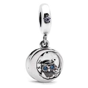 Um berloque lindo estilo pendente, perfeito para as mães Nele a a coruja com o seu filhotinho passam todo carinho do cuidado que só mãe tem. Os olhos azuis são incríveis. A doce mensagem Sempre ao seu lado está gravada em inglês em um disco prateado separado, pendurado atrás deles. No passador um estrelinha em baixo relevo com um ponto de luz dá delicadeza a peça. Não se engane com materiais folheados e banhados. Acabamento e polimento manuais. Material: Prata 925 e Zircônia. Cor: Prata e azul. Medidas aproximadas: 22mm de altura x 10mm de largura. Compatível com todas as pulseiras. Marca: Mundo Briller Ean: 7899057812130