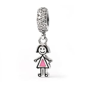 Como um desenho infantil, essa menininha sorri docemente com o seu vestidinho rosa. O passador com diversas Zirconias deixam a peça mais encantadora. Represente aquela criança especial na sua coleção. Berloque estilo pendente é fabricado em Prata 925 e esmalte. Não se engane com materiais folheados e banhados. Acabamento e polimento manuais. Material: Prata 925 e esmalte. Cor: Prata, rosa e preto. Medidas aproximadas: 25mm de altura x 3mm de largura. Compatível com todas as pulseiras. Marca: Não Informado