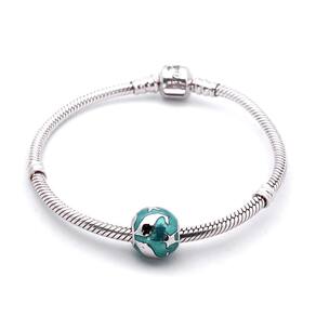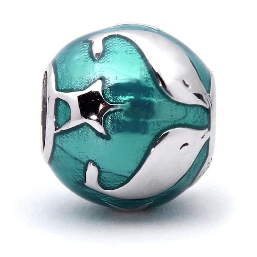 Berloque tipo separador com a figura de dois golfinhos fabricado em Prata 925 com detalhes esmaltados. Não se engane com materiais folheados e banhados. Acabamento e polimento manuais. Material: Prata 925 e esmalte. Cor: Prata e verde água. Medidas aproximadas: 10mm de altura x 08mm de largura. Compatível com todas as pulseiras. Marca: Mundo Briller Ean: 7805875800853