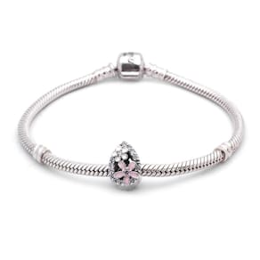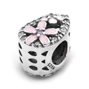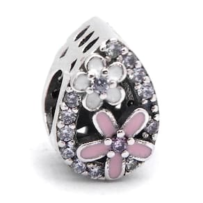 Berloque estilo separador em formato de gota com flores esmaltadas. Material: Prata 925, Zircônias e esmalte. Cor: Prata, rosa e branco. Medidas aproximadas: 10mm de altura x 7mm de largura. Compatível com todas as pulseiras.