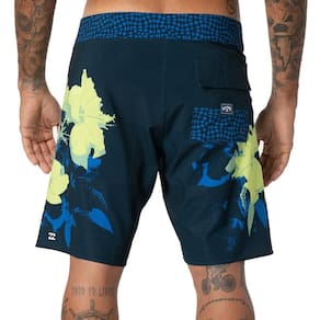 Bermuda Billabong feita em tecido com tecnologia 4 Way Stretch reciclado, derivado de garrafas pet, tecido projetado para o melhor desempenho, estabilidade, flexibilidade e conforto, revestimento repelente à água, tecido de secagem rápida, estampa exclusiva da coleção, bolso traseiro com lapela, patch bordado na perna e no bolso.