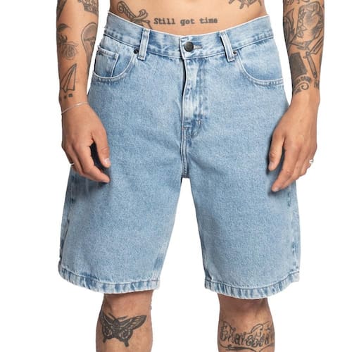 Bermuda Dc Shoes five pockets feita em modelagem oversize, lavanderia leve com marcações nas costuras e etiquetas personalizadas.