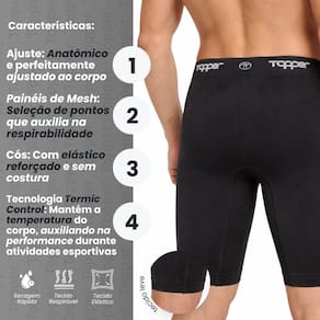 - Marca: Topper - Composição: 95% Poliamida/ 4% Elastano/ 1% Polipropileno - Modelo: Bermuda Térmica Masculina - Gênero: Masculino - Modelagem: Ajustada / Compressão - Comprimento: Acima do joelho - Indicação: Treino, ciclismo, corrida, futebol, academia e atividades esportivas - Costura: Sem Costura ( seamless ) - Painéis de Mesh: Seleção de pontos que auxilia na respirabilidade - Cós: Com elástico reforçado