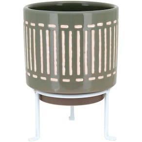 Bernan Cachepô 20x14x14cm Cerâmica Cinza Com Suporte O cachepô da linha Bernan é produzido com cerâmica de qualidade e pintado na cor verde e possui estrias pintadas na cor branca. Possui um suporte em aço pintado na cor branca. Esse produto é lindo e charmoso, ideal para decorar diversos ambientes internos e externos. Nele pode ser cultivada as suas plantas favoritas.