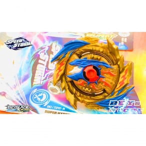 Inclui 1 lançador Beyblade Burst Speedstorm e 1 top de batalha competitivo de giro à direita: Super Hyperion H6 D83 TSP07-M.A parte superior inclui metal na ponta de desempenho, Disco Forge fundido e componente Storm Chip de giro à direita.
