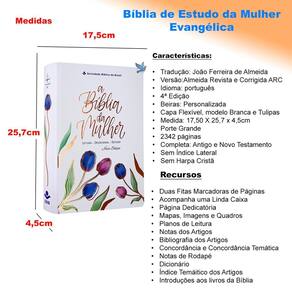 A Bíblia da Mulher nova edição, LANÇAMENTO em 2022, é uma Bíblia de Estudo sobre as mulheres da Bíblia e para as mulheres atuais, com concordâncias, dicionário, mapas e tudo sobre o papel da mulher na vida. Capa Flexível em material sintético, Modelo Branca e Tulipas. Tradução: João Ferreira de Almeida, Revisão: Almeida Revista e Corrigida ARC. Com Duas Fitas Marcadoras de Páginas. ACOMPANHA: Uma linda caixa de proteção preparada para ser um porta joias.