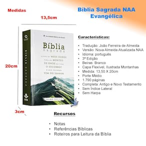 Tradução: João Ferreira de Almeida Versão: naa Nova Almeida Atualizada Idioma: português Beiras: Branco Capa Brochura, Ilustrada Montanhas Letra Gigante Medidas: 13,50 x 20cm 1.790 páginas Porte Médio 3 Edição