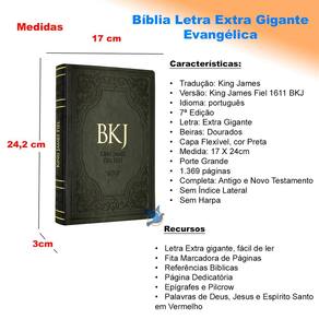 Tradução: King James Versão: King James Fiel 1611 BKJ Idioma: português Letra: Extra gigante 7 Edição Beiras:douradas Capa Flexível em Material Sintético PU, Cor Preta Medida: 17 X 24,2 X 3cm 1.369 páginas Porte Grande Completa: Antigo e Novo Testamento Sem Índice Lateral Sem Harpa