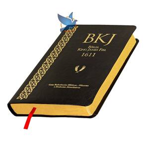 Tradução: King James Versão: King James Fiel 1611 BKJ Idioma: português Letra: Padrão 7 Edição Beiras: Douradas Capa Flexível em Material Sintético PU, Cor Preta Medida: 14 X 21,80 X 3,6cm 1.248 páginas Porte Grande Completa: Antigo e Novo Testamento Sem Índice Lateral Sem Harpa