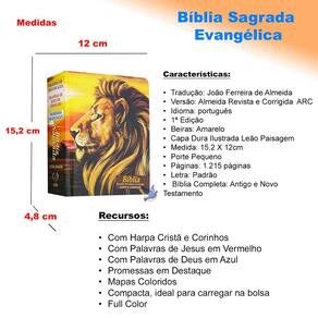 Tradução: João Ferreira de Almeida Versão: almeida Revista e Corrigida ARC Idioma: português Beiras: Amarela Capa Dura Ilustrada Leão Paisagem, cor Full Color Letra Padrão Medidas: 15,2 x 12cm 1.215 páginas Porte Pequena 1 Edição Com Harpa Cristã Sem Índice Lateral