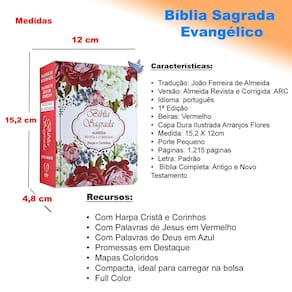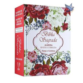 A Bíblia Sagrada na tradução de João Ferreira de Almeida, versão ARC Almeida Revista e Corrigida. Com Capa Dura Ilustrada, modelo Arranjos Flores, sendo Full Color. Acompanha Harpa Cristã e Corinhos. Palavras de Jesus em Vermelho e Palavras de Deus em Azul. porte Pequeno Compacta para transportar na bolsa . bíblia Completa: Antigo e Novo Testamento.