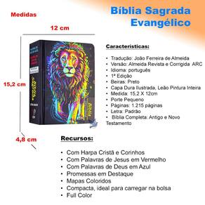 A Bíblia Sagrada na tradução de João Ferreira de Almeida, versão ARC Almeida Revista e Corrigida. Com Capa Dura Ilustrada, modelo Leão Pintura Inteira, sendo Full Color. Acompanha Harpa Cristã e Corinhos. Palavras de Jesus em Vermelho e Palavras de Deus em Azul. Porte Pequeno Compacta, ideal para carregar na bolsa . Bíblia Completa: Antigo e Novo Testamento.