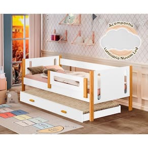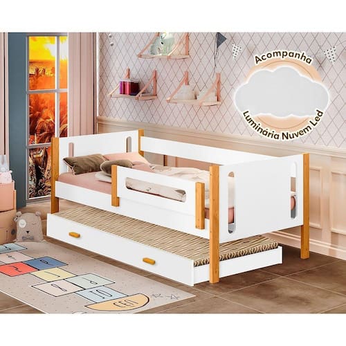 Bicama De Solteiro Mirela Branco/Amêndoa Com Grade De ProteçãoA cama infantil Mirela possui elegância e modernidade sem perder o conforto. Ainda oferece uma maior autonomia para o pequeno descer e explorar todo o cômodo, o que deixa o espaço não só mais divertido como também perfeito para estimular o desenvolvimento sensorial. Acompanha também cama auxiliar para acomodar visitas.Tipo: Cama SolteiroModelo: MirelaCor: Branco com AmêndoaGarantia: 90 diasProduto DesmontadoCama Auxiliar possui rodízios (rodinhas)Acompanha manual e kit de montagemCom Grade de Proteção dos dois ladosMaterial 100% MDFPés em madeira maciçaPintura UV Verniz BrilhoNão acompanha colchãoMedidas CamaAltura: 65cmLargura: 95cmComprimento: 195cmMedidas Cama AuxiliarAltura: 20cmLargura: 91,5cmComprimento: 189cmATENÇÃOIMAGENS MERAMENTE ILUSTRATIVAS REALIZADO EDIÇÃO, PODENDO HAVER UMA PEQUENA VARIAÇÃO DE COR DEPENDENDO DE CADA TELA OU MONITOR.