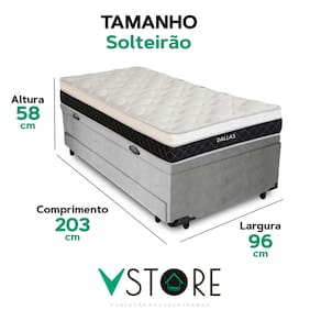 A tecnologia que a sua casa merece está na V-Store! A tecnologia e funcionalidade que sua casa merece estão aqui! O Conjunto Colchão Dallas e Bicama com Cama Auxiliar e Baú oferece conforto, praticidade e estilo. O colchão, com molas ensacadas, espuma D33, Euro Pillow e tecnologia EPS, proporciona excelente suporte, durabilidade e conforto térmico. A bicama, com cama auxiliar e baú espaçoso, otimiza o espaço do seu quarto, oferecendo suporte confortável para visitas e armazenamento extra para organizar o ambiente. Revestida com tecido sintético resistente, garante durabilidade e facilidade de manutenção. Característica Do Colchão: Modelo: DallasMarca: V-StoreTamanho: SolteirãoDimensões: 96x20x203 (Largura x Altura x Comprimento)Conforto: MédioSistema: Molas EnsacadasPillow: Euro PillowPeso Máximo recomendado: 150 kg (Por pessoa)Proteções: Antiácaro, antialérgico, antifungo, antimofoGarantia: 12 Meses (Espuma) / 10 anos ( Conjunto de Molas Ensacadas)Característica Da Base: Marca: V-StoreModelo: Bicama com BaúCor do Box: CinzaTamanho: SolteirãoDimensões: 96x44x203 (Largura x Altura x Comprimento)Estrutura: MadeiraPeso máximo recomendado: 150 kg (Por Pessoa)Altura do Box: 38 cmAltura dos Pés: 6 cmAltura total: 44 cmMedida Cama Auxiliar: 96x44x203 (LxAxC) cmGarantia: 12 Meses (Estrutura e Estofamento) / 3 Meses (Tecido)Selo Ecologicamente CorretoAtenção:- Antes de finalizar sua compra, recomendamos que verifique se as dimensões do produto são adequadas para serem transportadas pelos elevadores, portas, escadas e corredores de sua residência. Ressaltamos que não nos responsabilizamos pelo transporte do produto por meios específicos, como escadas, guinchos ou içamentos.- É possível que hajam leves variações de cor de acordo com o dispositivo que está sendo utilizado como smartphones, computadores, monitores e outros.