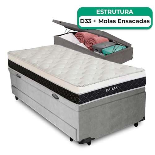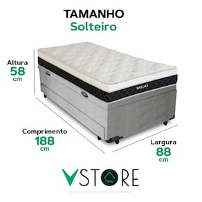 A tecnologia que a sua casa merece está na V-Store! A tecnologia e funcionalidade que sua casa merece estão aqui! O Conjunto Colchão Dallas e Bicama com Cama Auxiliar e Baú oferece conforto, praticidade e estilo. O colchão, com molas ensacadas, espuma D33, Euro Pillow e tecnologia EPS, proporciona excelente suporte, durabilidade e conforto térmico. A bicama, com cama auxiliar e baú espaçoso, otimiza o espaço do seu quarto, oferecendo suporte confortável para visitas e armazenamento extra para organizar o ambiente. Revestida com tecido sintético resistente, garante durabilidade e facilidade de manutenção. Característica Do Colchão: Modelo: DallasMarca: V-StoreTamanho: SolteiroDimensões: 88x20x188 (Largura x Altura x Comprimento)Conforto: MédioSistema: Molas EnsacadasPillow: Euro PillowPeso Máximo recomendado: 150 kg (Por pessoa)Proteções: Antiácaro, antialérgico, antifungo, antimofoGarantia: 12 Meses (Espuma) / 10 anos ( Conjunto de Molas Ensacadas)Característica Da Base: Marca: V-StoreModelo: Bicama com BaúCor do Box: CinzaTamanho: SolteiroDimensões: 88x44x188 (Largura x Altura x Comprimento)Estrutura: MadeiraPeso máximo recomendado: 150 kg (Por Pessoa)Altura do Box: 38 cmAltura dos Pés: 6 cmAltura total: 44 cmMedida Cama Auxiliar: 88x44x188 (LxAxC) cmGarantia: 12 Meses (Estrutura e Estofamento) / 3 Meses (Tecido)Selo Ecologicamente CorretoAtenção:- Antes de finalizar sua compra, recomendamos que verifique se as dimensões do produto são adequadas para serem transportadas pelos elevadores, portas, escadas e corredores de sua residência. Ressaltamos que não nos responsabilizamos pelo transporte do produto por meios específicos, como escadas, guinchos ou içamentos.- É possível que hajam leves variações de cor de acordo com o dispositivo que está sendo utilizado como smartphones, computadores, monitores e outros.
