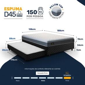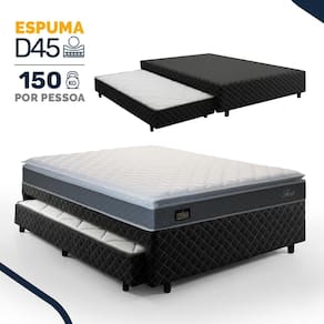 Espuma D45 (colchão principal), Espuma D28 (cama auxiliar), Poliéster (revestimento base box), Madeira tratada (estrutura base box)Vendido e entregue por Lucas Colchões